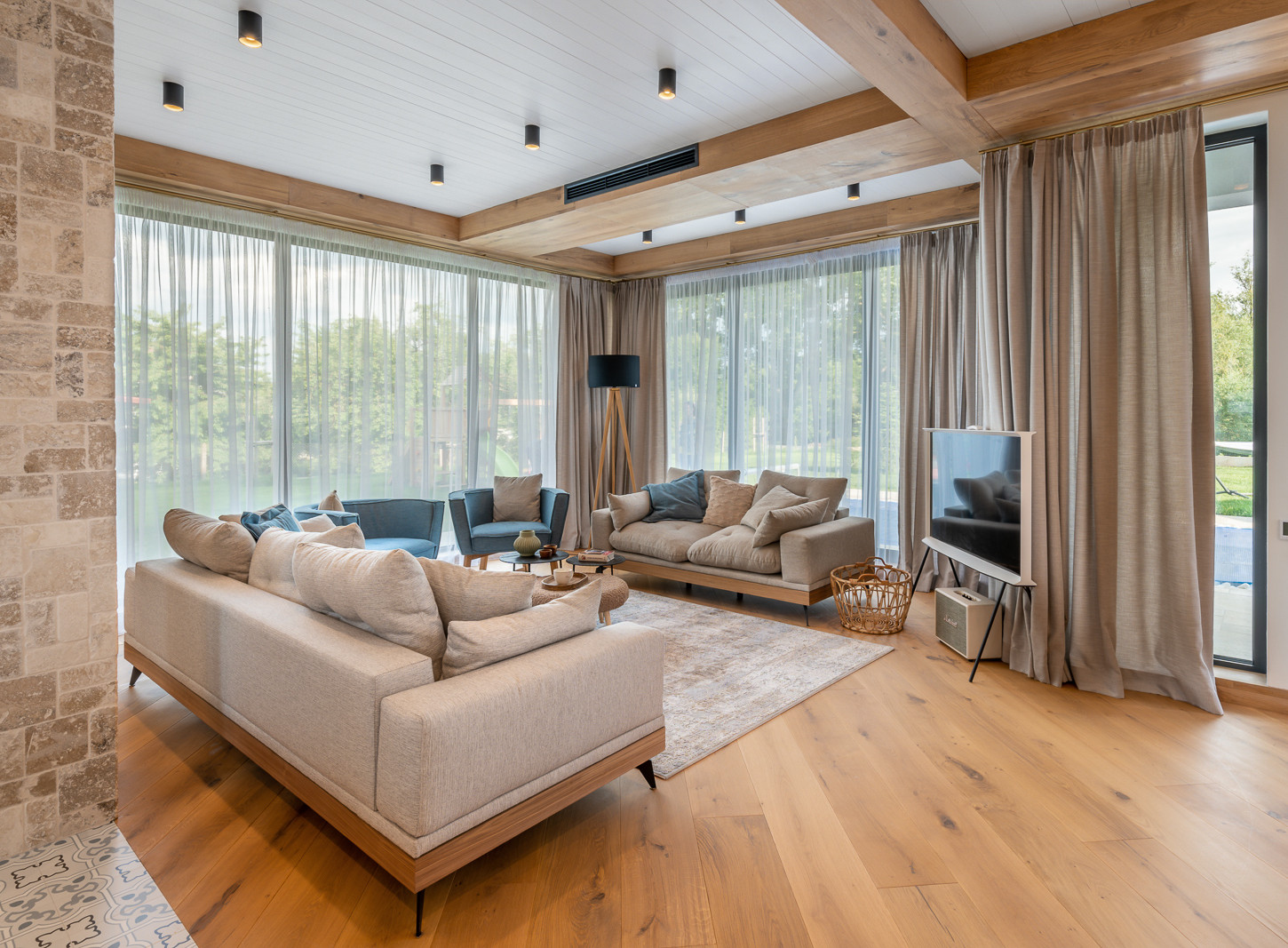В цялата къща използвахме масивна дъбова дървесина за пода и гредите по тавана, акцентите на стълбищния парапет; ламперията по стените и корпусните мебели също са комбиниран избор на естествено дърво и съвременни материали – всички те са проектирани от екипа на Студио ШкафА и реализирани от наши партньори; меката мебел и осветлението са от първокласни европейски и български производители.